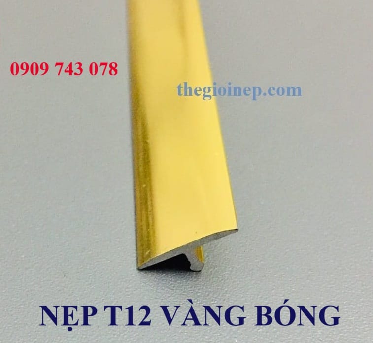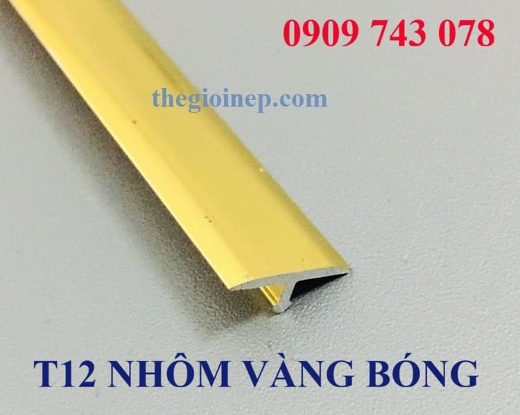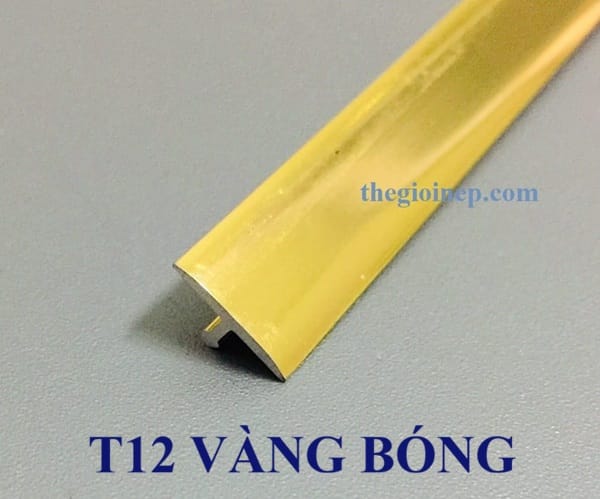 Được sản xuất từ chất liệu nhôm dày 1mm, biên dạng chữ T. Kích thước T12x4x2700mm, xi mạ màu vàng bóng. Kích thước khác cùng công dụng: T6mm, T8, T10mm, T14mm, T20mm, T25mm, T30mm và T50mm.